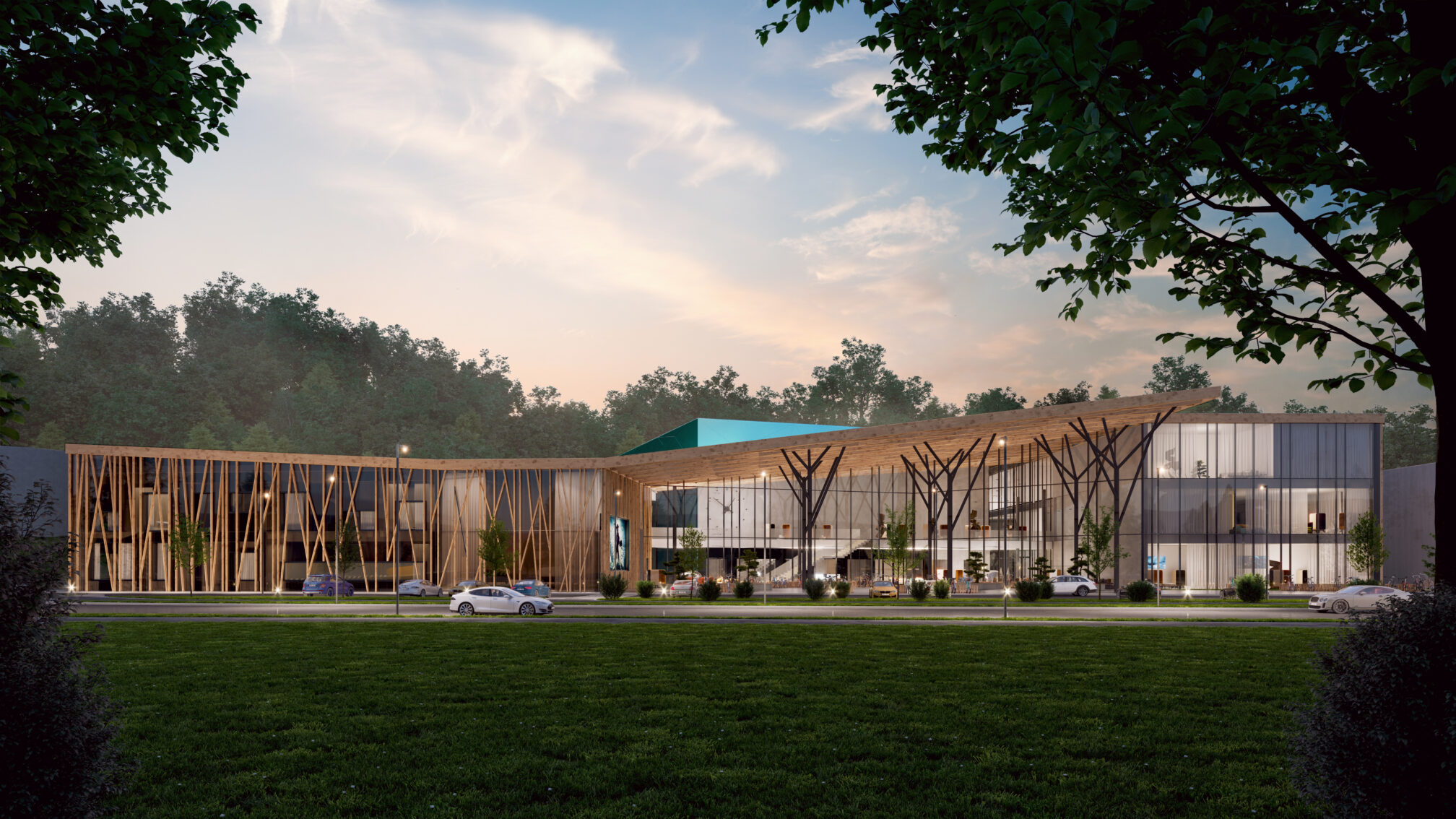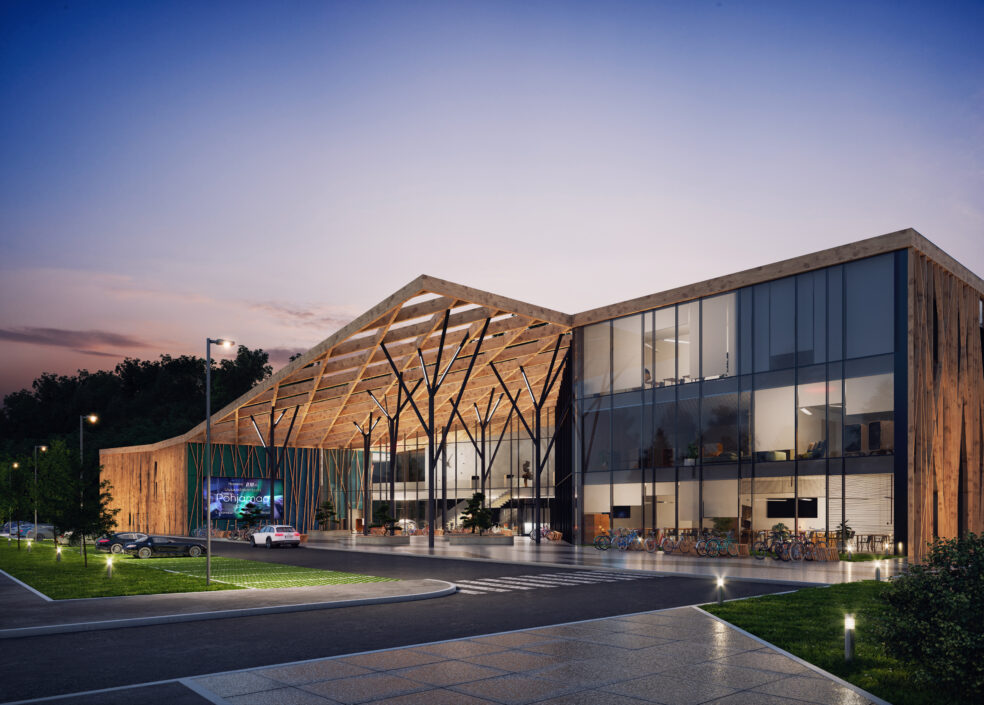 The building opens toward the road with a public square, welcoming all, and integrates the roadside area with the adjacent nature trail and forest edge. By distributing its functions across different volumes, the building encourages greater movement into the surrounding natural landscape and fosters closer social interaction among its users.
